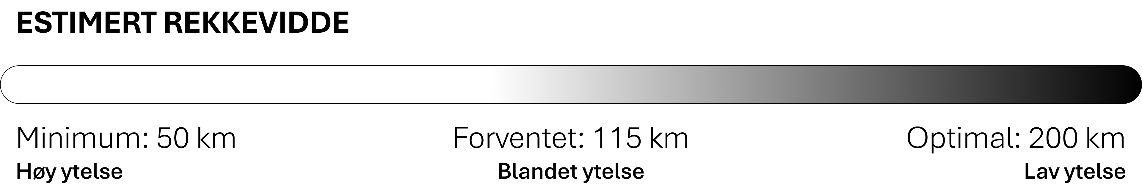 Optimal rekkevidde er det høyeste tallet og representerer det som er mulig under helt ideelle forhold. Det er et maksimum som krever blant annet flatt underlag, gunstig temperatur, lav last og aktiv tråkking på laveste motornivå.